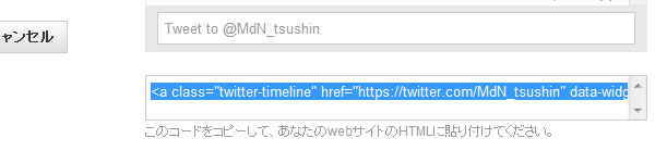 すると画面下部に、コードが表示されました。このコードをコピーしてWebサイトに張り付けましょう。実際にこのWebページ最下部にも埋め込んでみました。たったこれだけで、WebサイトにTwitterのタイムラインが表示できますので、興味のある方はぜひお試しください。