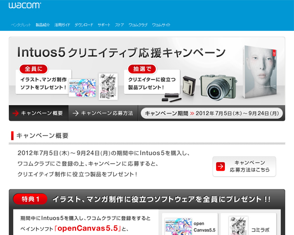本キャンペーンは、期間中にプロフェッショナル向けペンタブレット「Intuos5」シリーズ製品の購入後、「ワコムクラブ」に登録して、キャンペーンにお申込めば、もれなく全員にペイントソフト「openCanvas5.5」とマンガ制作ツール「コミラボ」(共に製品版シリアルキー)がプレゼントされるというもの。