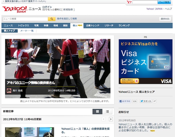 ヤフー株式会社は、インターネットニュース配信サイト「Yahoo!ニュース」において、新カテゴリ「Yahoo!ニュース 個人」を追加したことを発表した。