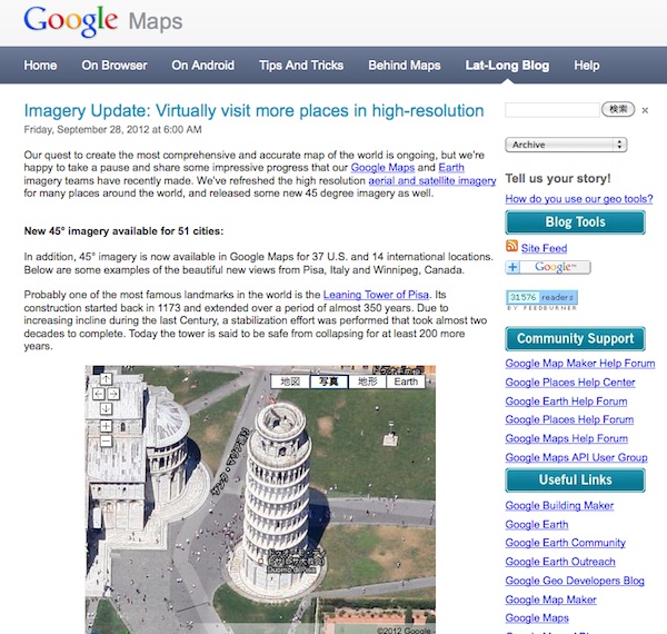鳥瞰写真は、米国内の37カ所のほか世界14の地域について追加。最も有名な場所にイタリアの「ピサの斜塔」やカナダのウィペニグを例に挙げ、写真を公開している。また、航空写真・衛星写真も多数の国・地域で更新されており、日本の航空写真も更新された。