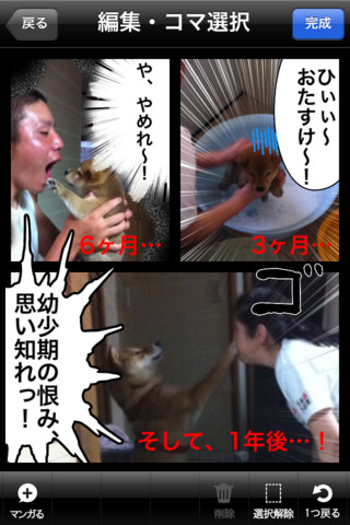 同アプリは複数の写真をコマ割りしてマンガ風に加工できるアプリで、集中線や書き文字、擬音など50種類以上の素材を使ってマンガ作成が可能。自由に文字を記入することも可能なので、マンガの名台詞を再現することもできる。作成したマンガはTwitterやFacebookで共有することも可能で、アプリ内に保存すればいつでも再編集できる。素材の前後を入れ替えたり、大きさを指先で微調整したりすることも可能だ。