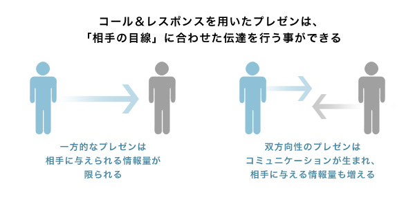 相手を交えた直接の場で行う必要性のふたつ目は、「伝達力をより高めるために、双方向性を生かしたプレゼン」が有効だということ。プレゼン中にコール&レスポンスを用いることで、質疑応答など相手の中に生まれた疑問や悩みをリアルタイムに汲み取りながら、進行できるメリットが生まれる。それにより、相手の理解度を高めることにつながっていく。