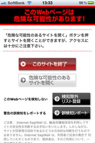 同アプリは、同社がWindowsパソコンやAndroidスマートフォン向けに提供しているオンライン詐欺対策ソフト「Internet SagiWall」の検知エンジンを搭載したiPhone向けアプリ。ブラックリスト方式だけでは対応できない、日々新たに発生する詐欺サイトに対しても危険性を自動的に判断し、警告を表示してくれる。