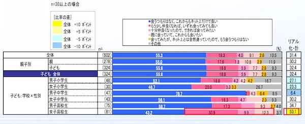 さらに、「ネットで知り合った人とコミュニケーションを更に深めていきたい」と1番強く考えているのも女子高校生で、これから会いたい・すでに会ったのは53.1%にのぼった。