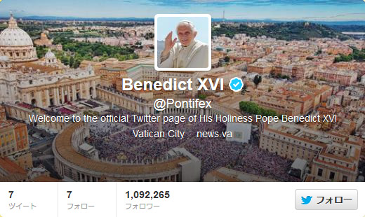 ローマ法王ベネディクト16世のTwitterアカウント(@Pontifex)が、フォロワー数100万を突破した。