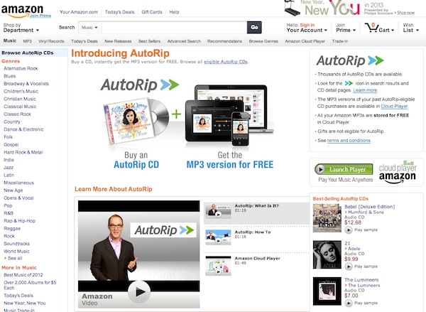AutoRipでは、Amazonがサービスを開始した1998年以降に発売されたCDで、AutoRipに対応しているものであれば、CD購入後に自動的にユーザーの「Amazon Cloud Player」ライブラリに楽曲が自動的に追加される。また、AutoRipのMP3データはライブラリの保存容量にカウントされないので、容量を気にせず音楽を楽しむことが可能だ。