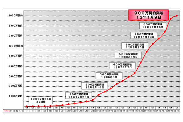 株式会社エヌ・ティ・ティ・ドコモ(NTTドコモ)は、高速通信サービス「docomo LTE Xi」の契約数が1月9日に900万を突破したと発表した。