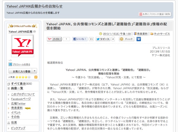 ヤフー株式会社は、一般財団法人マルチメディア振興センターが運営する「情報コモンズ」と提携し、「避難勧告」「避難指示」が発令された際、同社が提供する「防災速報」ならびに「Yahoo!天気・災害」において、発令情報を配信すると発表した。