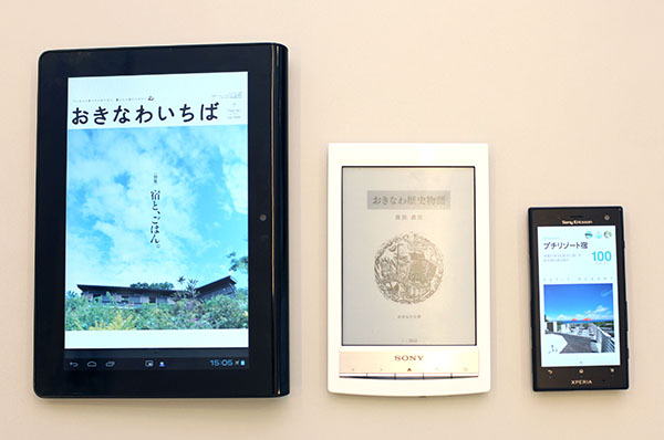 ブックリスタが取り扱い、Reader Storeで購入できる『おきなわいちば』『おきなわ文庫』『OKINAWA 100シリーズ』(左から)。続々とラインナップが追加されている(表示させた端末は左から「Sony Tablet」「Reader」「Xperia」)。