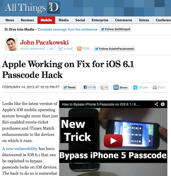 YouTubeに「How to Bypass iPhone 5 Passcode on iOS 6.1 / 6.0.2 / 6.0.1 . Prank your friends. 」というタイトルの動画が投稿された。これはiOS 6.1がイスントールされているiPhoneでパスコードロックを解除せずに操作する方法を解説するもので、ネット上で衝撃が走っている。