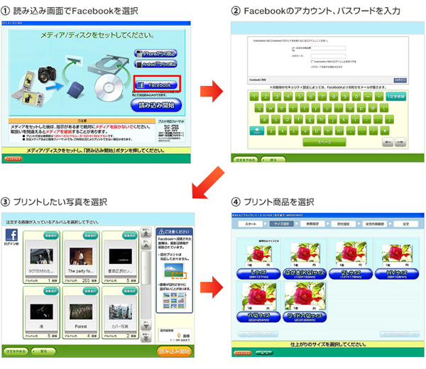 同サービスは、富士フイルムの店頭受付ソフトウェア「オーダーキャッチャーNEO」がインストールされたプリント受付機に「Facebook連携機能」を追加することで実現した。同機能により、プリント受付機の操作画面からFacebookアカウントとパスワードでログインするだけで、Facebook上の画像が読み出されて、プリントしたい画像を選択して注文できる。読み出されるのは自分が投稿した画像および、ほかのユーザーがタグ付けして共有された画像となる。