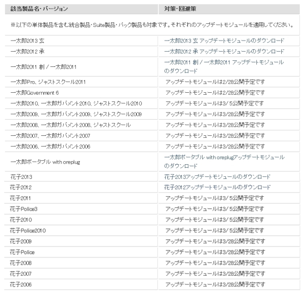 アップデートモジュール提供の第一弾は、「一太郎2013 玄」「一太郎2012 承」「一太郎2011 創/一太郎2011」「一太郎ポータブル with oreplug」「花子2013」「花子2012」となっており、そのほかのバージョンに関しても、2月28日から順次公開予定となている。