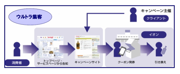 同発表によると、3社は今後、ICT(情報通信技術)を使っての取り組みを開始するという。O2Oサービスとは、オンライン・ツー・オフラインの略で、オンラインのネットを使って、オフラインの実店舗へ誘導する仕組みの事を言う。「ウルトラ集客」は、「Yahoo! JAPAN」のトップページのバナー広告を入り口に、各種キャンペーンの特典をイオンやイオンモールで受け取れるようにして、来店を促すもの。