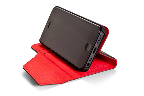 同製品はフォールド型デザインが特徴的なiPhone5用ケースだ。インナーには人工スエード素材、カバー側面にはポリカーボネート素材が使われている。カードが入るポケットや画面を見やすくする調整用スタンド、取り外し可能なストラップなども用意。