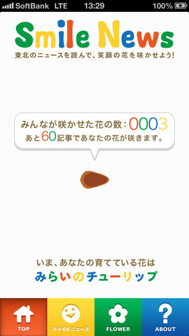 同アプリは3社が交替で東北の「今」がわかるニュースを365日配信するアプリ。同プロジェクトの基幹活動である、被災地で花を植え育てる「咲かせよう笑顔の花」プロジェクトと連動しており、記事を読めば読むほどアプリの中で花が生長し、花が咲いたら自分のネームプレートつきで実際に被災地に花が植えられる。