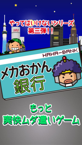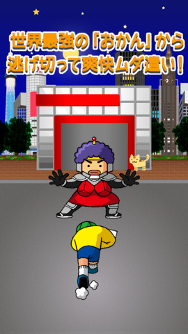 目当ての店に入れさせないように変則的に動く「メカおかん」に捕まらないように、タイミングを見計らってダッシュし、無駄遣いをするのが目的でステージが進むごとに「メカおかん」のスピードがアップするほか、動きのバリエーションも増える。無駄遣いした金額はiPhoneのGame Centerに登録されて、全国のユーザーと金額を競い合える。