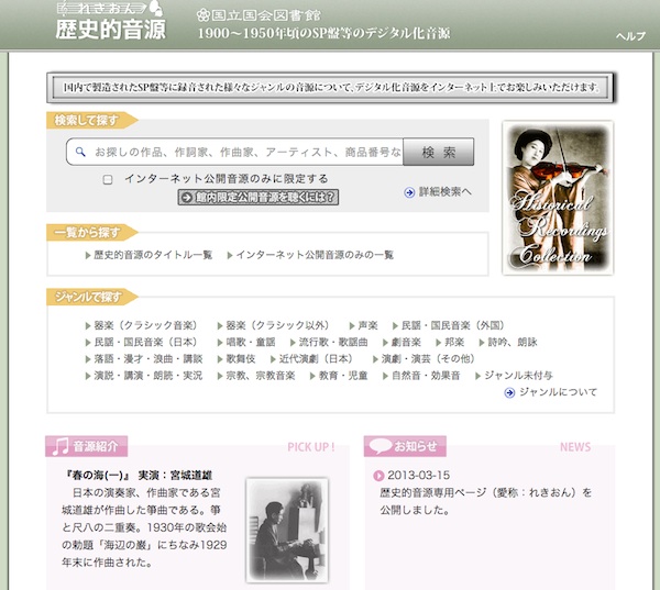 国立国会図書館は、「国立国会図書館デジタル化資料」内にある資料のうち、歴史的音源のみを検索・再生できる歴史的音源専用ページを公開した。