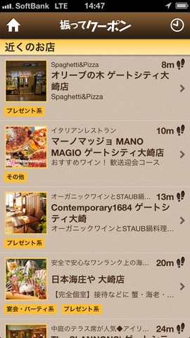 同アプリは、店名を入力したり、エリアやカテゴリから探したりする必要がなく、振るだけでクーポンを入手できるアプリ。アプリを起動してiPhoneを振ると近くにある飲食店が距離の目安とともに表示されて、一覧画面でクーポンの有無や提供しているクーポンの種類で絞り込める。