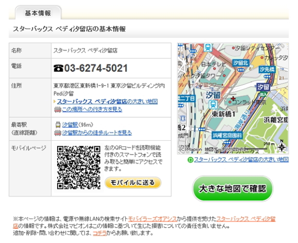 同発表によると、新たな情報は、街の電源検索サイト「モバイラーズオアシス」から情報提供を受けて掲載されるという。掲載件数はファストフード店や喫茶店、空港など3000件に及ぶ。電源・ネットワーク情報が提供されるのは、iPhoneアプリ「地図マピオン」、パソコンサイト/スマートフォンサイト「マピオン」の各コンテンツとなっている。