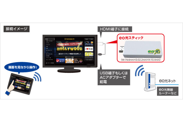 同サービスは、幅約8cm、質量約30gのコンパクトなスティック端末を使ったサービスで、専用アプリをインストールしたスマートフォンやタブレット端末で操作できる。「TSUTAYA TV for eo」の約4万タイトルの映画やドラマを楽しめるほか、マルチスクリーンサービスにも対応しており、同じIDでログインすることでeoスマートリンクタブレットやeo光テレビチューナーに接続したテレビ、PCなどでも作品を視聴できる。