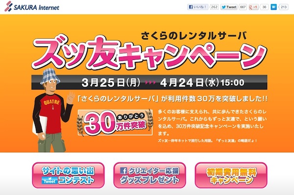同キャンペーンでは、「さくらのレンタルサーバ」を期間内に申し込むと初期費用5000円が無料となるほか、「さくらのレンタルサーバ」永年無料権をかけたTwitterコンテスト、クリエイター応援グッズが当たるFacebookキャンペーンを実施。キャペーン期間は2013年4月24日(水)15:00まで。また、キャンペーンサイトには「ズッ友」の解説について「昨年ネットで流行した用語。「ずっと友達」の略語だょ!」と書かれている。