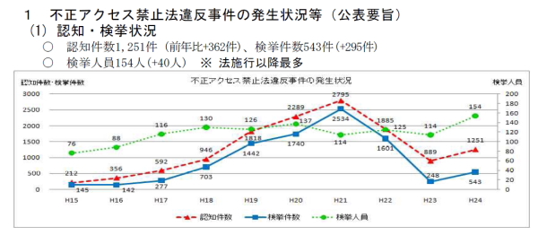 同発表によると、平成24年中の摘発者数は、2000年の不正アクセス禁止法の施行以来最多となる154人にのぼった。認知件数は1251件で、そのうちオンラインゲームやコミュニティサイト・SNSの不正操作が662件(52.9%)と大半を占めた。内容としては、他人のアイテムやゲーム内通貨の不正取得などとなっている。