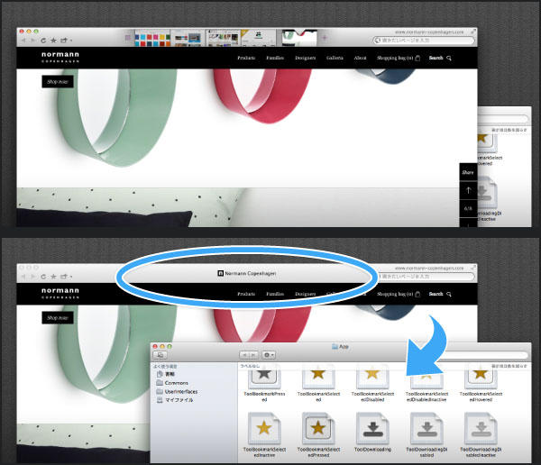 ページの中身がそのままわかるサムネイルのタブは、Sleipnir for Macの特長のひとつ。一方で、サムネイルがもっとも見やすくなるようにタイトルバーを省きました。でも、実はあるんです。Sleipnir for Macを非アクティブにすると、タブバーは隠れてページタイトルが表示されます。Sleipnir for Macから少し離れたあとに「なんのページを見ていたっけ?」とはなりません。ツールバーのスペースを最大限に生かすには、状況やタイミングまでデザインすることが大切なのです。
