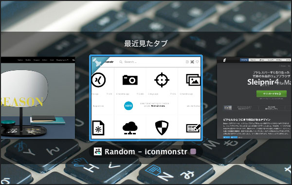 [⌘]+[F1]キーを押すことで、タブを表示した順に辿ることができるタブスイッチ機能。[W]キーを押せば、タブを閉じることもできます。ここで注目していただきたいのは、保護されたタブを閉じようとしたときの挙動です。当然閉じないのですが、無反応では手応えがなく不安になります。そこで、ひと目でわかるフィードバックとして“ぽよん”と跳ね返るようにしました。閉じようとしたけど閉じなかった、ということをアニメーションで伝えています。