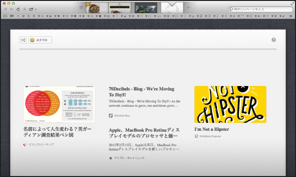 Sleipnir for Mac独自の新規タブページ「Site Updates」は、毎日チェックするほどでもないけど興味はある、というWebサイトの更新情報を教えてくれます。情報収集するよりカジュアルに情報をお届けしたいという想いからデザインしたSite Updates。その中身は、じつはRSSです。ユーザーがよく見るWebサイトのフィードをもとに、数を絞って毎回入れ替わるようにしています。ともすれば膨大な新着数に追われることがあるRSSも、デザイン次第で気軽な喜びや驚きに変えることができるんです。