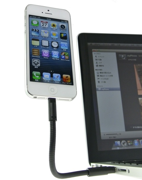 同製品は、自由に変形させることが可能な20cmの金属性Lightningケーブル。USB2.0を搭載し、パソコンなどに接続しiPhone5を同期したり、充電させることができる。また、好きな角度・位置に固定できるので、同期・充電中に画面を自分のほうに向けたり、スタンドのみの利用も可能だ。