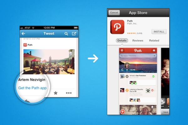 発表によると、アプリ開発者側がTwitter Cardsの「mobile app deep-linking」機能に対応していれば、アプリを利用して投稿されたツイートに、そのアプリへのアプリストアのリンクが表示されるという。また、Twitter Cardsにアプリストアのリンク付きカードやフォトアルバムへのリンク付きギャラリーカードなども追加され、サードパーティにとっては自ら開発したアプリへのさらなる誘導が可能となった。