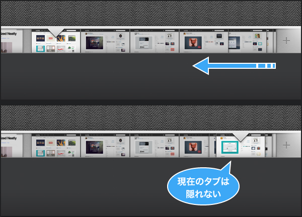 Sleipnir for Macは、たとえタブが100個あっても目的のタブがすぐに見つかるWebブラウザとしてデザインしました。となれば、タブがツールバーに収まり切らなくなっても、つねに探しやすくすることは必須。さらに、すっきりとした美しさはそのままに。これを実現するために、スクロールするとタブが左右に隠れるのではなく、両端で重なるようにしました。全体がつねにツールバーに収まって見え、タブがいくつあってもすっきりとした美しさは変わりません。また、現在のタブは見失わないように、端に引っかかって留まるようにしています。