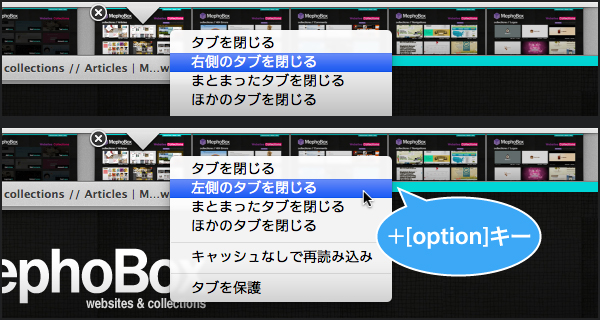 タブを右クリックすると、まとまったタブを閉じたり、右側にあるタブをすべて閉じることができます。しかも、すべて閉じられるのは右側だけではありません。[option]キーを押すとメニュー項目が変化して、“左側をすべて閉じる” が現れます。すべての機能を並べてしまうと、よく使う機能が見えづらくなるので、ふだんは省いています。けれど、ちゃんとできるようにしておく、というのは、Sleipnir for Macの色々なところに共通して見られる思想でもあります。これも、先端的なデザインの形です。