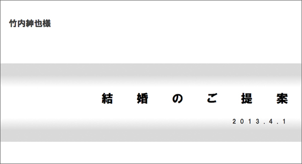 竹内さん●これは、プロポーズの前日に飲み会の場でLIGのみんなから出たアイデアです。僕としても、商談の際に提案書と契約書をセットでもっていく、というのは自然なことですので、特に違和感はありませんでした。