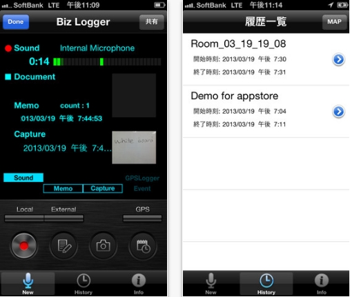 情報は音声をメインにタイムライン形式で表示され、必要な情報をすぐに引き出せる。また、記録したデータはスケジューラと同期でき、GPSデータも記録される。Bluetoothを経由することで、「Biz Logger」のユーザー同士で情報の共有ができる。