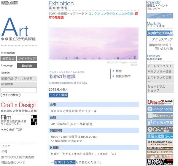 東京国立近代美術館のコレクションによる都市をテーマとした小企画展。最上層の「スカイライン」、下層の「アンダーグラウンド」、表層の中の多層性の意味での「パランプセスト」に注目し、絵画/版画/写真/映像/資料など約50点が紹介されている。休館日は月曜(7月15日は開館)と7月16日で、開館時間は10:00〜17:00(金曜は20:00まで/入場は閉館30分前まで)。一般420円/大学生130円/高校生以下・65歳以上など無料。