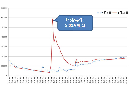 4月の話題度ランキングは、ベスト10のうち8件が4月13日に発生した淡路島震度6弱の地震関連のワードになった。5時33分ごろから10分間で71万1020件のツイートが投稿されており、直前の10分と比較すると10倍以上のツイートが投稿されたことになる。この結果により、同社は「地震が起きたらまず現況をツイートする」という行動が定着していると分析している。