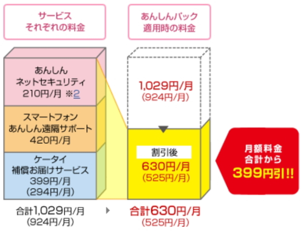 「あんしんパック」は、「ケータイ補償 お届けサービス」、「スマートフォンあんしん遠隔サポート」、「あんしんネットセキュリティ」の3つのサービスで、割引額399円となる月額料金630円で利用できる。対応機種は2012年3月以降発売のドコモ スマートフォン/ドコモ タブレット。