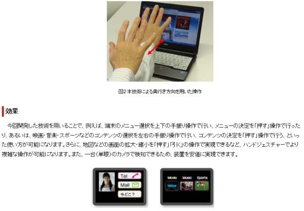 株式会社富士通研究所と富士通研究開発中心有限公司は20日、パソコンやタブレットなどに搭載されている一台(単眼)のカメラで撮影した映像から、手の動きを上下・左右方向だけではなく、奥行き方向も検知する、「3次元ハンドジェスチャー認識技術」を開発したと発表した。