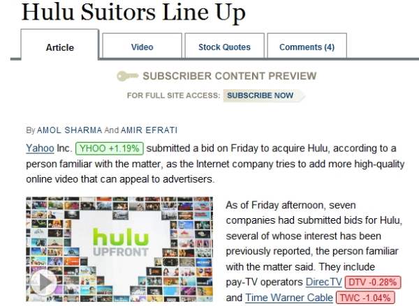 WALL STREET JOURNALやReuters(ロイター)などアメリカの複数のメディアは、米Yahoo!がオンライン動画配信サービスHulu(フールー)の買収レースに参加していると報じた。