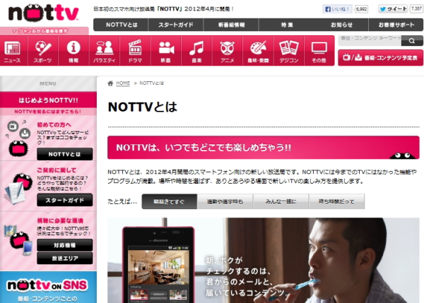 「NOTTV」は、ニュースやスポーツ、ドラマ、音楽、アニメ、バラエティなどの番組が、月額420円の定額で見放題になる番組配信サービス。2012年4月に開局され、427日かけて2013年6月1日に100万契約を獲得した。