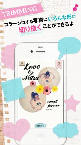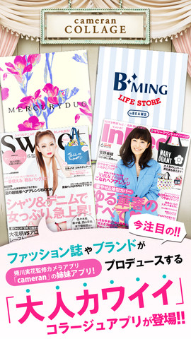 同アプリは、オトナ可愛い写真を簡単にコラージュすることが可能な蜷川実花監修カメラアプリ「cameran」の姉妹アプリ。ファッション誌「sweet」「InRed」、ファッションブランド「MERCURYDUO」「B:MING LIFE STORE by BEAMS」がプロデュースする可愛いスタンプ・背景・フレームなどのアイテムで自由にコラージュできる。このほか、作成した写真はFacebook、Twitter、LINEなどのSNSで共有することが可能だ。