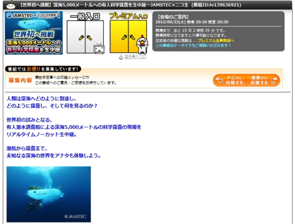 株式会社ドワンゴと株式会社ニワンゴは7日、独立行政法人 海洋研究開発機構とのコラボ企画として、有人潜水調査船「しんかい 6500」での世界最深熱水噴出域の調査潜航の様子を、動画サービス「niconico」の「ニコニコ生放送:Q」において生中継すると発表した。ライブ配信は6月22・23日に行われる。番組の視聴には、ニコニコのアカウントは必要なく、ネット環境があれば国内外の誰でも視聴できるとしている。