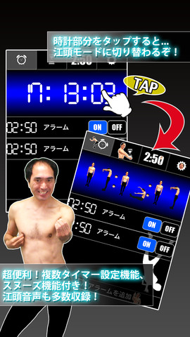 「江頭アラーム」は実用的なアラームアプリで、江頭2:50の迷言や珍言、雄叫び等をアラーム音に設定できる。複数のタイマーを分単位で同時に設定可能で、スヌーズ機能も搭載する。また、アラーム解除にミニゲームを設定することも可能だ。タイマー機能も搭載しており、キッチンタイマーとしても使用できる。