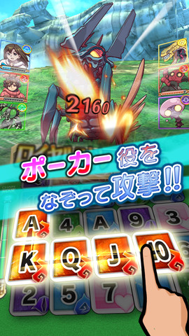 同アプリは“超攻撃型ポーカー”を武器に世界を冒険するポーカーパズルRPG。多くのカードの中から5枚並んだポーカーの役をなぞって消すことによりモンスターを倒して捕獲し、手に入れたモンスターは図鑑に集められる。モンスター同士を合成すれば進化して強化できる。