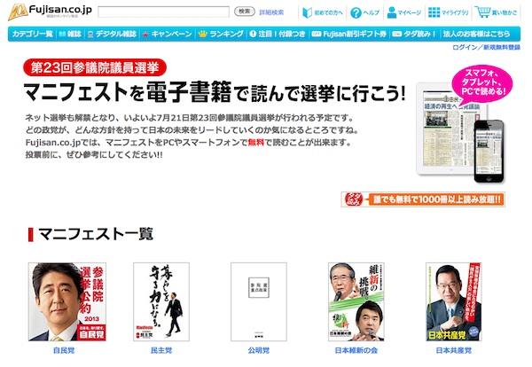 株式会社富士山マガジンサービスは、同社運営の雑誌のオンライン書店「Fujisan.co.jp」において、無料サービス「マニフェストを電子書籍で読んで選挙に行こう!」の提供を開始した。