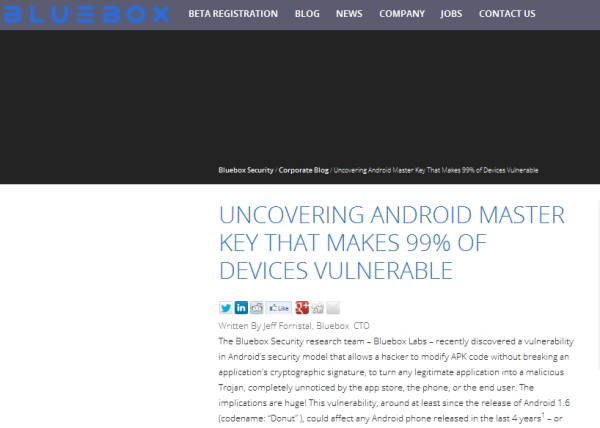 米モバイルセキュリティのベンチャー会社Bluebox Securityは3日(米国時間)、Androidのセキュリティに重大な脆弱性を発見したと発表した。対象端末は過去4年に発売された9億台にのぼり、これは同期間に出荷されたAndroid端末の99%にあたる。