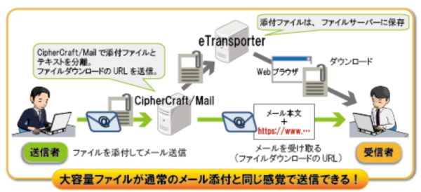 今回の大容量ファイル転送機能は、株式会社NSDビジネスイノベーションの「eTransporter」と連携することで実現したという。仕組みは、メールに添付された大容量ファイルを、自動で分離してファイル転送システム「eTransporter」によって送るというもの。