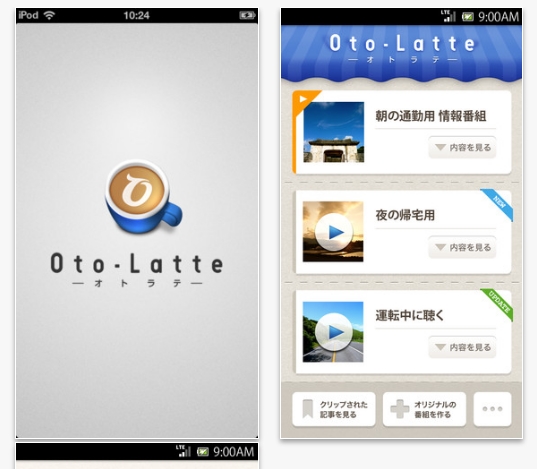 「Oto-Latte」は、時事情報や芸能ニュースを読み上げる「NEWS」、スマートフォン本体内の音楽を再生する「MUSIC」、天気などを読む「LIFE STYLE」からなる、音声読み上げアプリ。