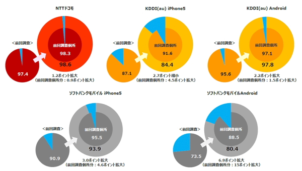 各社ともLTE/4Gエリア化率を伸ばし、つながりやすさへの設備拡大が順調であることがうかがえる。1位と2位の差を見てみると、前回の1.8ポイント差から0.8ポイントになり、KDDI(au)Androidがドコモに肉薄している。また、ソフトバンクモバイルAndroidは6.9ポイント拡大と拡大率が最も高かった。